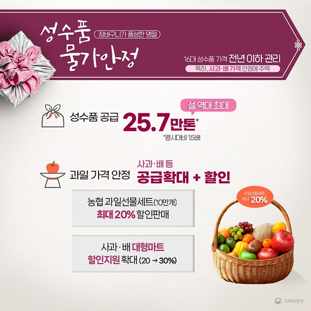 - 과일 가격 안정(사과·배 등) 공급 확대 + 할인