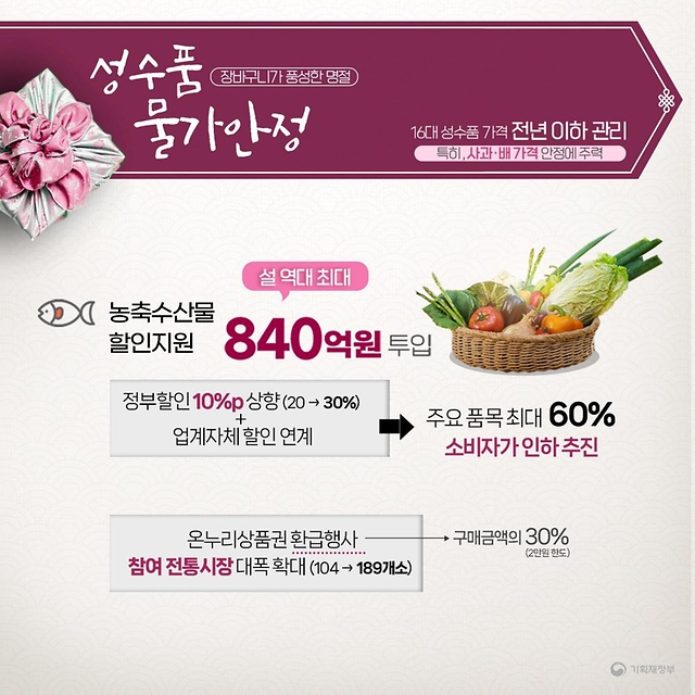 - 농축수산물 할인지원에 설 역대 최고 수준 840억 원, 전년대비 2.2배